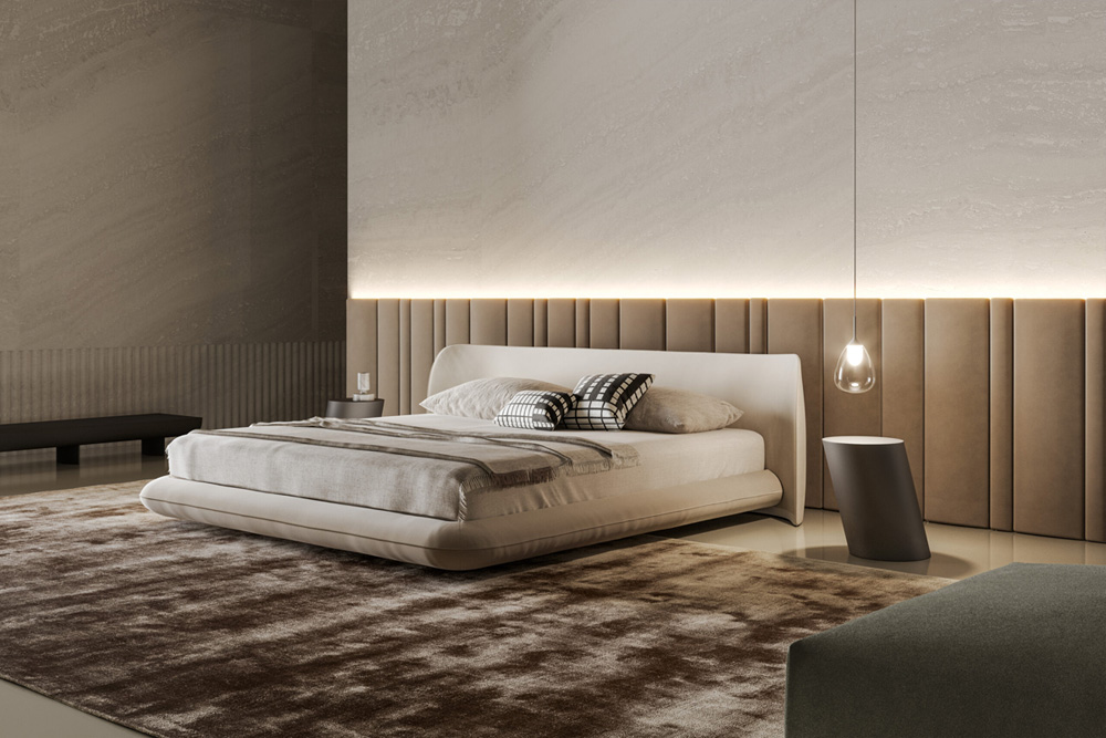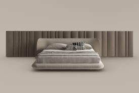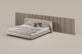 Bonaldo Design. Massimo Castagna Dimensions : l 209/215/235/249 x h 75 x p 236/241 cm Nubo n’est pas seulement un lit à deux places, mais une expérience qui transforme la manière de vivre la chambre à coucher. Formes et éléments s’entrelacent en un dialogue sensoriel qui donne naissance à un espace au fort impact visuel, à la fois intime et enveloppant. Dessiné par Massimo Castagna, Nubo, avec la boiserie homonyme, interprète le concept de légèreté par l’intermédiaire d’une présence organique et fluide, rappelant l’image d’un élément suspendu et en constante évolution, comme un nuage. Sa présence est délicate et distinctive : un volume qui interagit avec l’espace, en redéfinissant ses proportions et en influençant sa perception. La géométrie de la tête de lit, basse et sinueuse, accueille avec naturel la structure harmonieuse du lit et attire le regard et le toucher, tandis que la fluidité des formes ondoyantes est une invitation au repos. La boiserie rembourrée, proposée comme élément optionnel, enrichit ultérieurement le dialogue avec l’architecture environnante, en devenant une extension naturelle du design et en contribuant à créer une continuité visuelle qui estompe les limites de l’espace, en lui donnant profondeur et caractère.