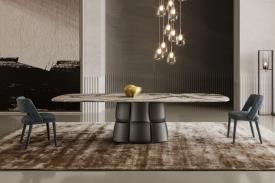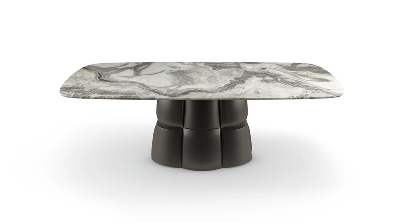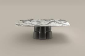 La table Palazzo s’inspire de l’observation de l’architecture historique et, en particulier, des façades de la Renaissance florentine caractérisées par des blocs massifs de pierre brute, symbole de robustesse et de puissance. Le jeu de lumières et d’ombres sur les surfaces majestueuses des édifices constitue le design de la base, composée de deux éléments symétriques moulés en polyuréthane à haute densité qui s’unissent pour former une structure imposante, mais légère et élégante à la fois. L'équilibre esthétique de la table est en outre influencé par le choix du plateau avec angles arrondis, qui est disponible en bois, céramique et marbre. Palazzo réinterprète l’architecture du passé au goût du jour, en incluant l’histoire dans le design d’intérieur et en alliant force, élégance et contemporanéité.