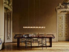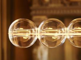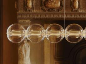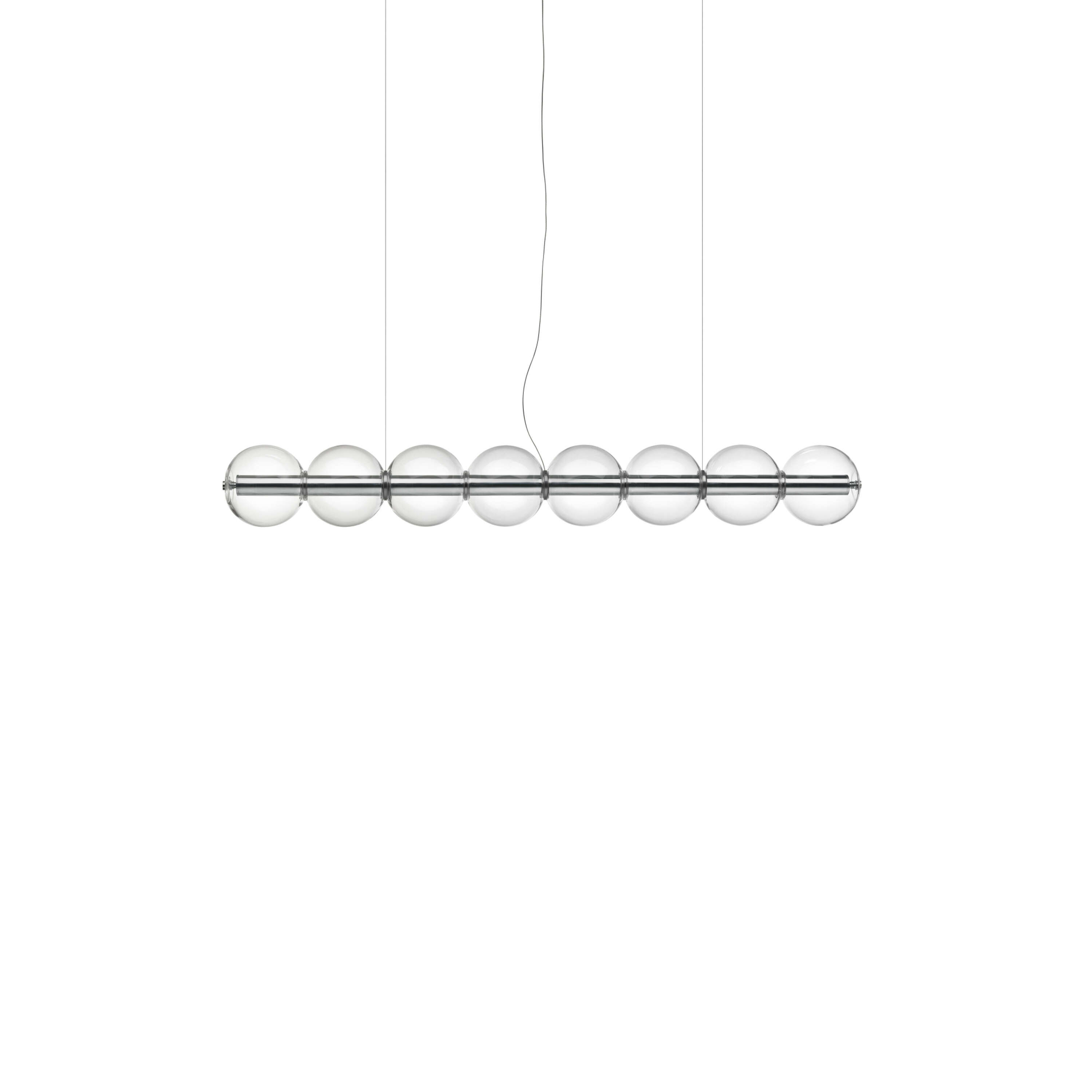 Flos Design. Ronan Bouroullec, 2025 - F3752000 Dimensions l 167 x h 21,5 x p 21,5 cm Suspension modulaire émettant une lumière diffuse. Corps horizontal en aluminium extrudé poli avec deux rubans LED pour un éclairage vers le haut et vers le bas. Variateur tactile intégré pour contrôler indépendamment l'intensité lumineuse. Corps recouvert dune série de sphères en verre transparent soufflé à la main, délimitées par des séparateurs traditionnels. Peut être installée en plusieurs rangées parallèles. Environnement Intérieur – emplacement sec lampe suspension