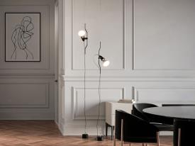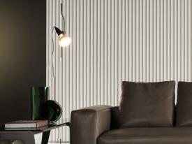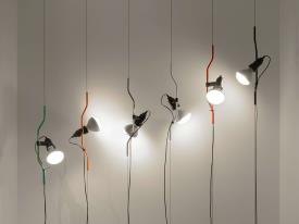 Flos Design. Achille Castiglioni and Pio Manzu, 1971 - F5600030 Dimensions : Ø 11 x h 400 cm Lampe à lumière directe dont la partie éclairante peut être déplacée verticalement, grâce à un tube en acier recouvert d'un vernis liquide ou nickelé, le long d'un filin en acier tendu entre le plafond et le sol, longueur 4000 mm. Tête en élastomère moulé par injection coloris noir. Sur le câble il y a le dimmer électronique qui permet de régler pas à pas l'intensité lumineuse. Environnement Intérieur – emplacement sec lampe suspension