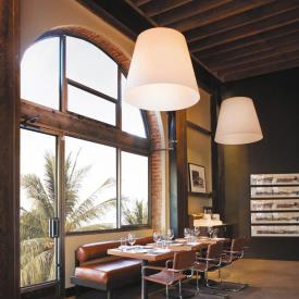 Amax, une interprétation extra-large de l'abat-jour classique FontanaArte, est une famille de suspensions. Les modèles les plus grands sont dotés d'un disque inférieur qui dissimule les sources lumineuses.