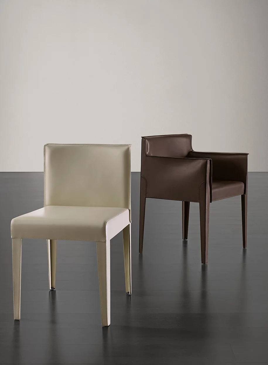 Une collection de chaises, disponible avec ou sans accoudoirs, dotée une âme métallique entièrement recouverte d'un cuir de très haute qualité, agrémentée de surpiqûres apparentes et de surpiqûres ton sur ton. Le léger rembourrage de l'assise et du dossier apporte du confort à la chaise.