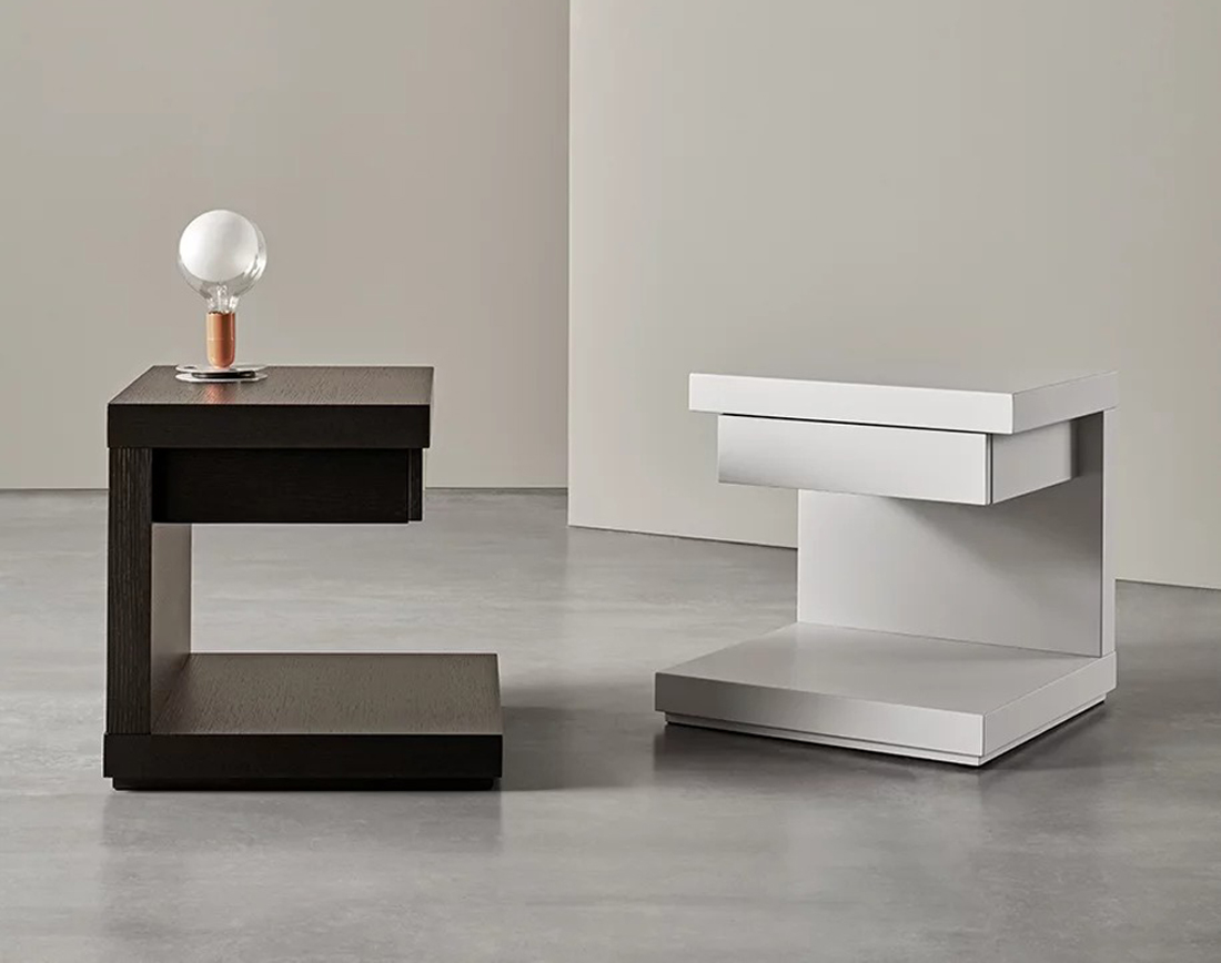 Des formes carrées et solides, des lignes épurées et essentielles définissent cette table de nuit avec structure en bois ; elle est disponible avec une finition en bois, en laque brillante ou mate.
