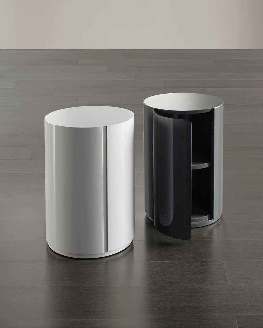 Collection de table de chevet de forme cylindrique, avec deux espaces de rangement et une étagère ; que ce soit en bois ou avec des finitions laquées mates ou brillantes, à l'intérieur, elles se marient parfaitement avec les tables basses Gong.