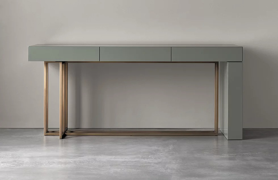 Console à trois tiroirs jouant sur l’équilibre entre remplissage et vide. L’association des différentes finitions pour la base en métal et le plateau, ainsi que les bords en bois ou en laque, souligne la texture de ces deux éléments. Quincy définit fortement l'ambiance de tous les intérieurs