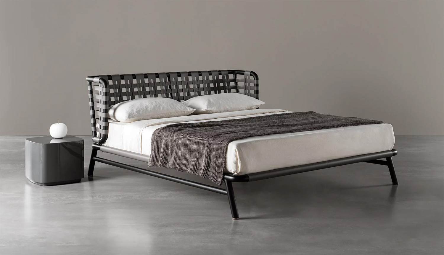 Le travail manuel et la couture sont à la base de la fabrication du lit Edoardo. La simplicité de la structure en bois massif contraste avec les volumes importants de la tête de lit, disponible en trois versions avec une personnalité distincte. La première version, rembourrée d'un revêtement en tissu et délimitée par son cadre, est enveloppante et raffinée. La seconde constitue une invitation à la détente car elle présente un aspect plus doux et plus confortable, grâce aux finitions à volants plats. Enfin, la version en cuir tressé donne au lit un aspect rigoureux, mais tout aussi spectaculaire : le travail complexe apporté au tissage se marie au souci du détail pour le traitement traditionnel.