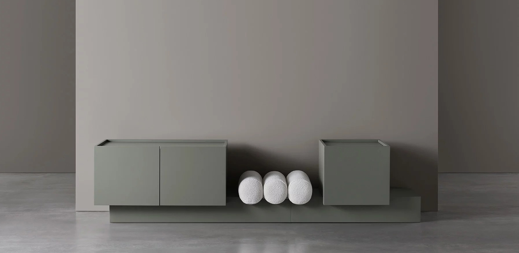 En option: des coussins cylindriques de deux tailles différentes à fixer à la base. Un projet à la fois vaste et modulaire qui permet de créer un meuble esthétiquement homogène et compact, mais aussi matériellement articulé, offrant la flexibilité idéale pour se fondre dans l'atmosphère des différents environnements.