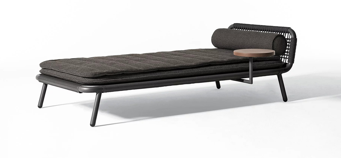 Pureté graphique raffinée, simplicité formelle et matériaux soigneusement sélectionnés sont les trois éléments caractérisant le transat Noa Open Air, qui s'inspire des lits de camp d’extérieur. Inspirée des cordes d’amarres, la corde en polypropylène est soutenue par une ossature en aluminium peint. Il est disponible en version entièrement tressé ou avec assise en tissu Batyline. Il dispose de divers accessoires pour le compléter : de la table basse orientable en iroko, au matelas pour un meilleur confort, en passant par l’oreiller ou le traversin.