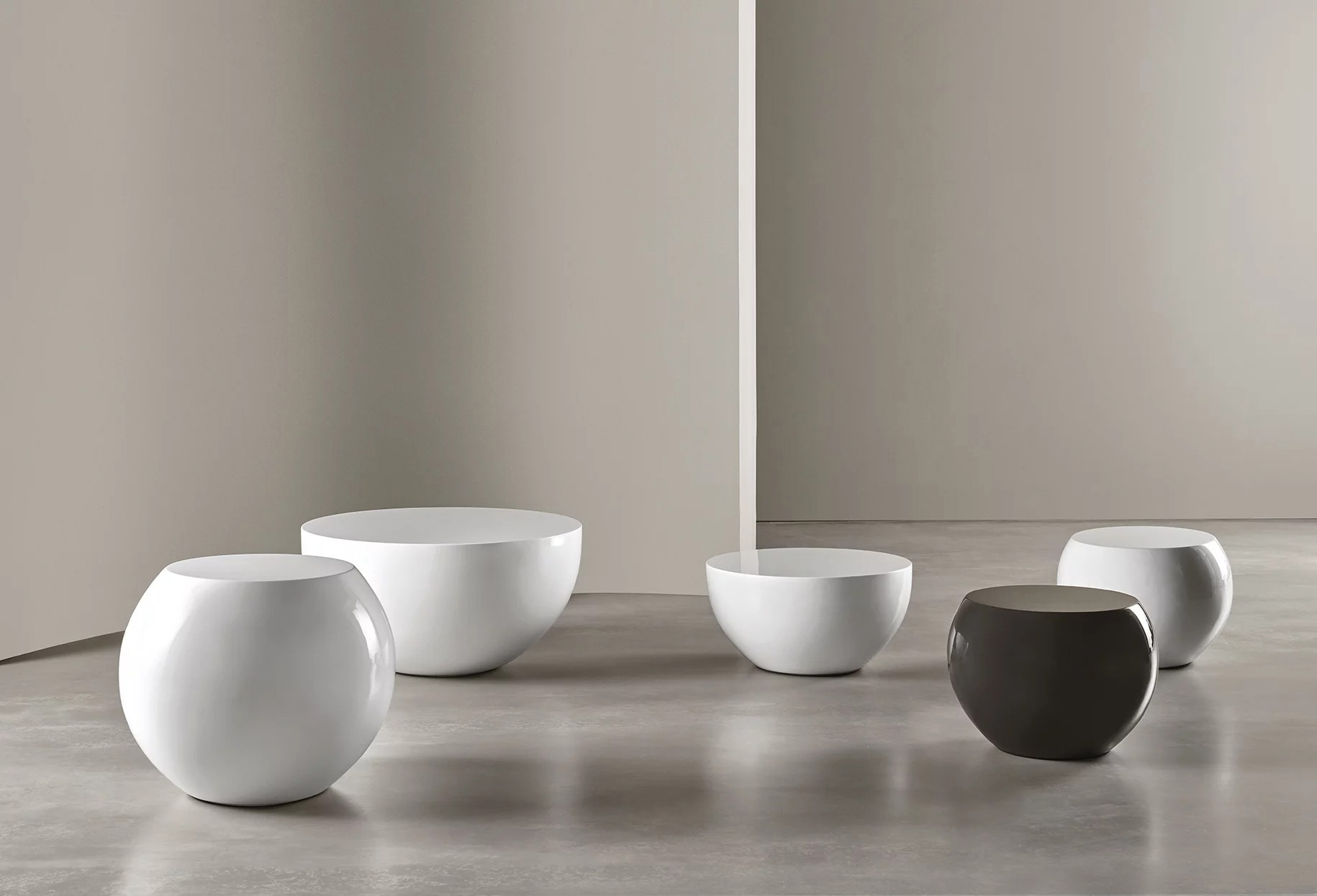 Plusieurs déclinaisons d'un solide géométrique caractérisent l’apparence de cette famille de tables basses, disponibles en différentes tailles et en couleurs laquées, dont la finition mate rend le produit utilisable également à l'extérieur. Un voyage à travers les formes et les couleurs disponibles, qui permet de créer des compositions raffinées entre la structure et le plateau.