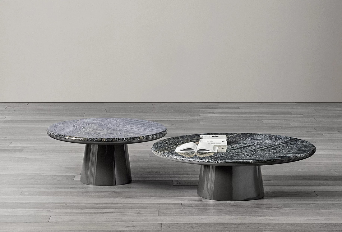 Leon est une collection de tables basses monolithiques, qui peuvent être réalisées en laque, ou en combinant la base et le dessous laqués avec le plateau marbré. Dans la version marbrée, la finition apportée à la coupe circulaire, séparant le dessus du dessous, devient un élément décoratif, pour créer une pièce unique en son genre. La version 2022 se présente complètement en marbre pour plateau et base, pour un effet encore plus sculptural.