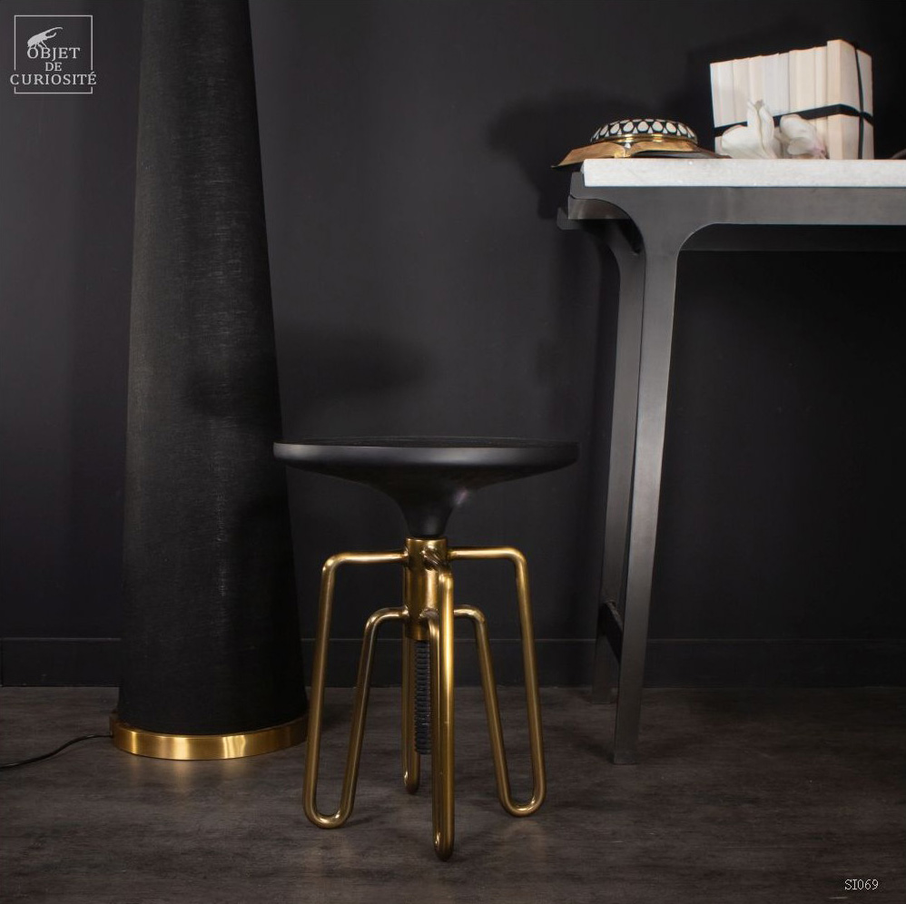 Noir et laiton, ce tabouret en aluminium est également doté d'un pas de vis pour être réglable en hauteur. Il peut être réglé à une hauteur minimale de 45cm, comme sur la photo avec Lilau, à une hauteur maximale de 58 cm.