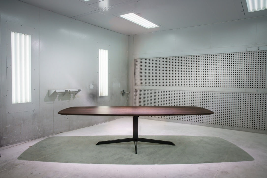 Dimensions : l 250/300 x h 75 x p 100/120 cm Plateau en bois ou céramique, pieds en acier table