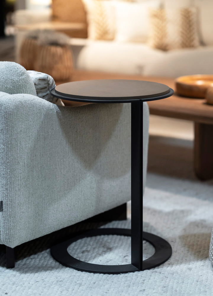 Dimensions : Ø 45 x h 60 cm Plateau en bois, pied en acier bout de canapé