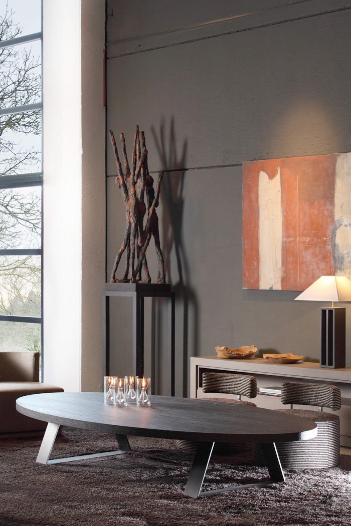 Dimensions : l 125/140 x h 40 x p 220/250 cm Plateau en bois ou céramique, pieds en acier table basse