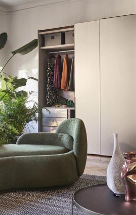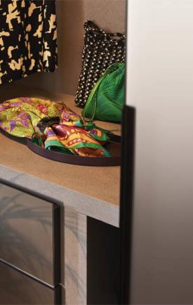 La ligne fine et continue du cadre dessine un contour discret et minimaliste. En aluminium laqué ou anodisé noir, il souligne la série de modules verticaux ou se fond harmonieusement dans le décor, en s'accordant avec les finitions des portes disponibles en verre laqué, miroir, bois, finitions texturées, similicuir et laques mates ou brillantes. Longue et légèrement inclinée, la poignée prolonge la ligne du cadre, conférant à la porte une allure élégante et linéaire et offrant une excellente prise en main, quel que soit le type de porte (battante, coulissante ou à galandage).
