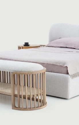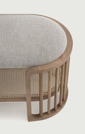 Le bruissement des roseaux résonne dans cette collection contemporaine et polyvalente. L'effet linéaire des pleins et des vides crée un design harmonieux, rassurant et délicat. Le banc est doté d'une assise rembourrée et d'une étagère en rotin tressé, à la fois fonctionnelle et élégante.