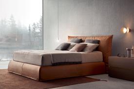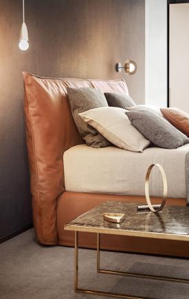La douce chaleur d'un nid douillet : des volumes généreux et enveloppants invitent à la détente absolue. Rythmés harmonieusement par une verticalité affirmée, les proportions de ce lit s'expriment pleinement dans la tête de lit qui s'étend sur toute la hauteur du cadre. Le grand coussin d'un mètre de haut, généreusement garni de plumes, offre un soutien moelleux à la tête et au dos. Ce lit est également disponible en version divan, capitonnée et revêtue de tissu, de cuir ou de similicuir amovibles.