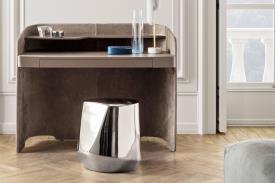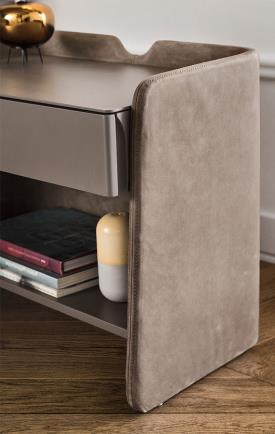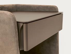 Un design rassurant aux lignes douces et aux formes enveloppantes. La structure en forme de C enveloppe et soutient les éléments de cette collection de meubles : incurvée et capitonnée, avec une silhouette douce et sinueuse, elle peut être revêtue de tissu ou de cuir pour un effet raffiné. La continuité des surfaces et l'absence de poignées soulignent un design exclusif, caractérisé par la discrète rainure sur le côté en bois des tiroirs permettant une prise en main aisée.