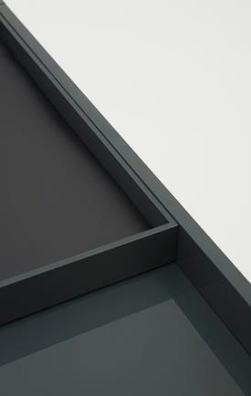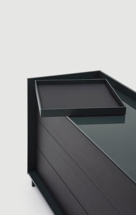 Un charme intemporel et un design minimaliste. Cette collection atteint un équilibre esthétique parfait. La structure plus profonde et enveloppante renferme des tiroirs à ouverture par simple pression, définissant ainsi le volume de l'ensemble. Le plateau, une niche ouverte, offre une surface discrète et élégante où l'on peut ajouter un accessoire : un plateau à fond recouvert de similicuir pour ranger effets personnels et bijoux. Le piètement légèrement incliné apporte une impression de légèreté.